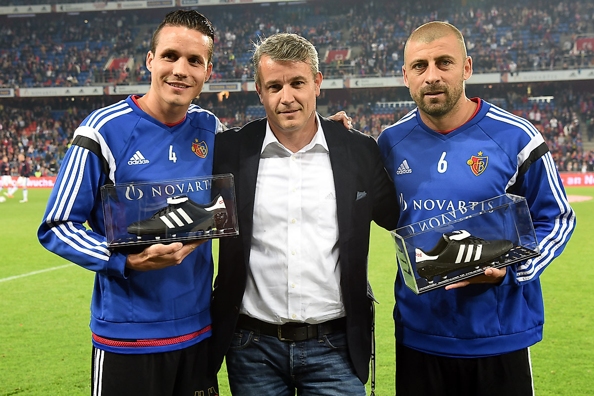 21.29: Beat Lerch, Marketingleiter von adidas Schweiz, überreicht Walter Samuel und Philipp Degen ein Abschiedsgeschenk.