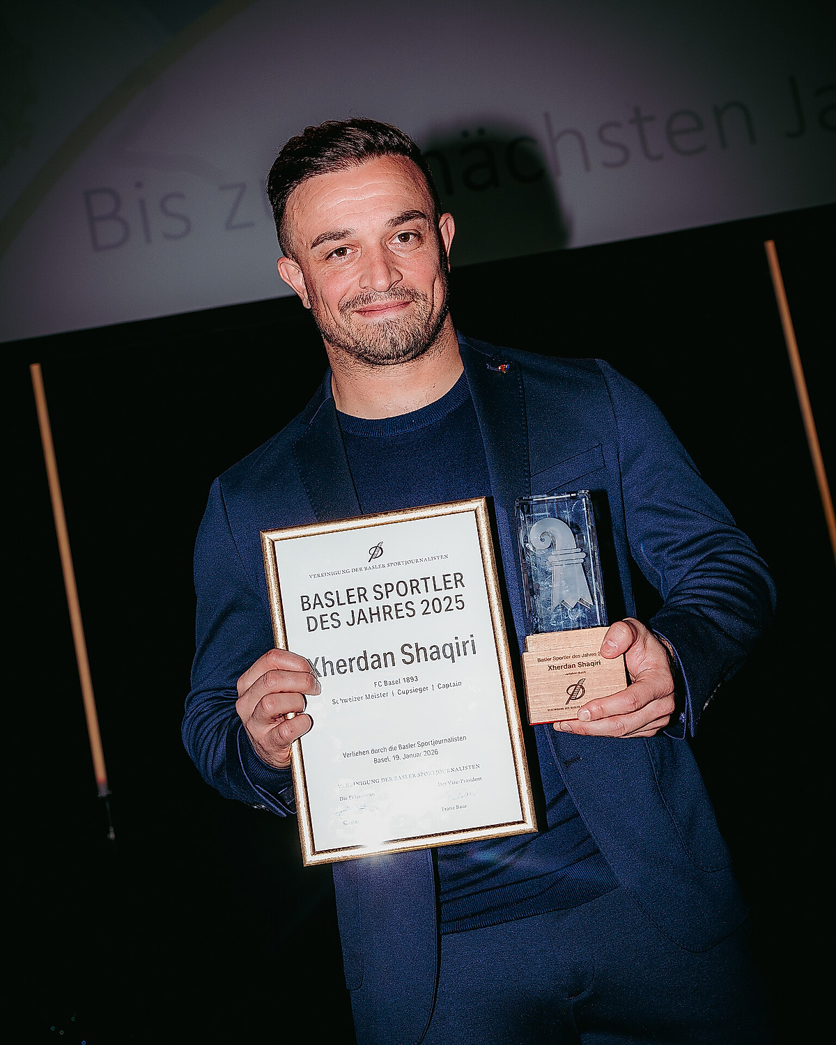 Mit dem Gewinn des Doubles feierte der FCB im vergangenen Jahr einen grossen sportlichen Erfolg. Für diesen wurde Rotblau nun nochmals offiziell geehrt – und zwar auch gleich doppelt. Als Captain sowie zentrale Figur des Meisterteams und Spieler aus der Region wurde Xherdan Shaqiri zum «Basler Sportler des Jahres 2025» ausgezeichnet. Die Laudatio zu Ehren des FCB-Captains hielt SFV-Präsident Peter Knäbel, der Shaqiri noch bestens aus seinen Zeiten als Leiter der Nachwuchsabteilung bei Rotblau kennt.
