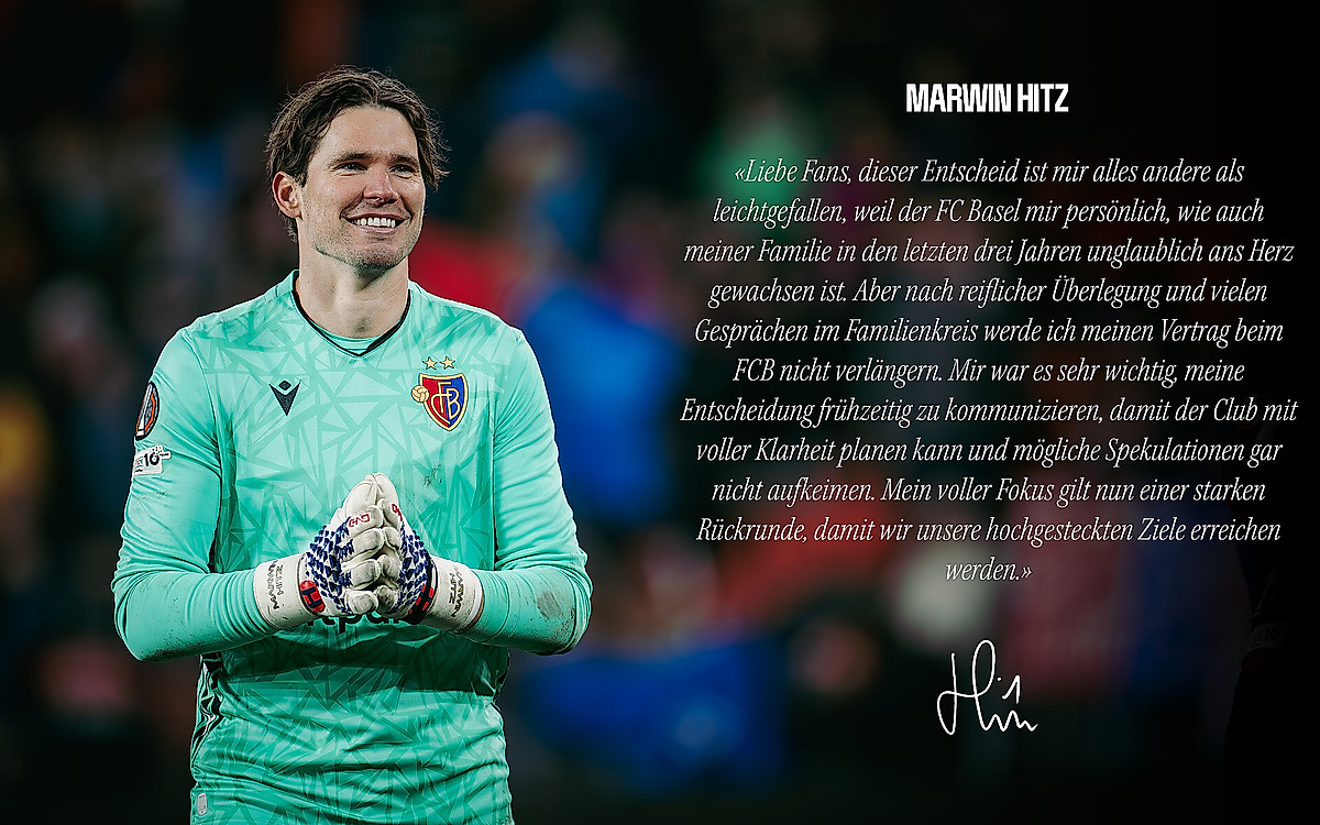 Im Trainingslager in Marbella fand ein Gespräch zwischen Marwin Hitz und Sportdirektor Daniel Stucki über den im Sommer auslaufenden Vertrag unserer Nummer 1 statt. Nach reiflicher Überlegung hat Marwin Hitz sich entschieden, sein Abenteuer beim FC Basel 1893 im kommenden Sommer zu beenden und den Vertrag nicht zu verlängern.