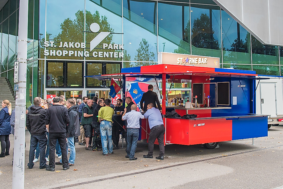Nun ist er da, der lang ersehnte FCB-Barwagen. Gemeinsam mit Wassermann & Company sowie der Feldschlösschen Getränke AG hat der FC Basel 1893 den rotblauen Barwagen entworfen, der ab sofort an jedem FCB-Heimspiel direkt vor dem Fanshop stehen wird. Wir würden uns sehr freuen, bereits anlässlich der Partie gegen den FC Thun vom Samstag, 21. Oktober 2017, möglichst viele Fans an der «Stäärne Bar» begrüssen zu dürfen. Hopp FCB und Proscht!